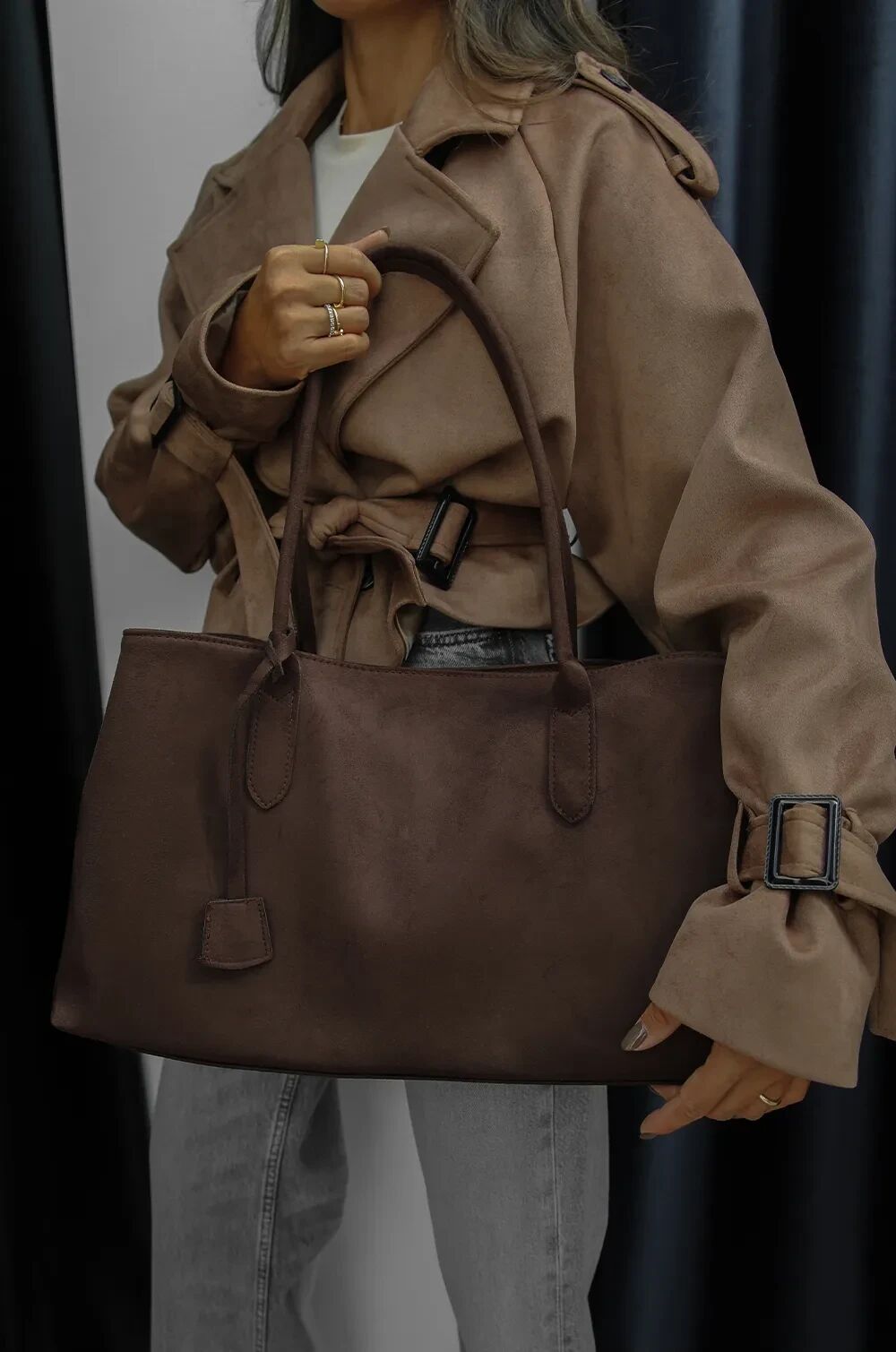 Çift saplı yapısı, omuzda rahat taşıma imkânı sunar. Yumuşak süet kumaşı, zarif bir görünüm ve dokusal zenginlik katar.