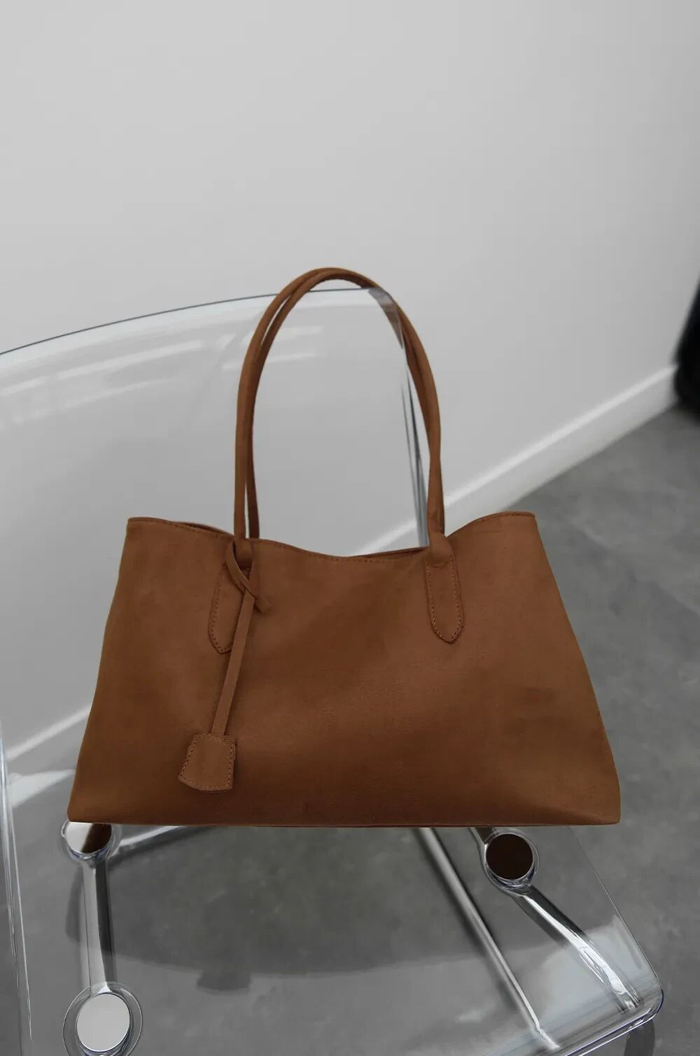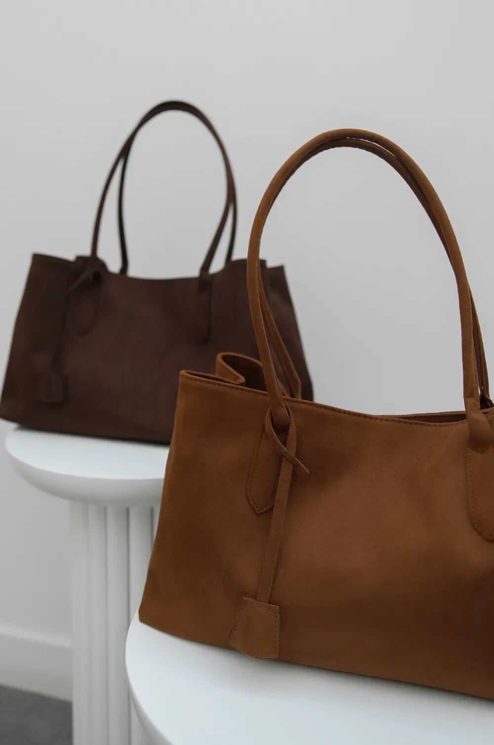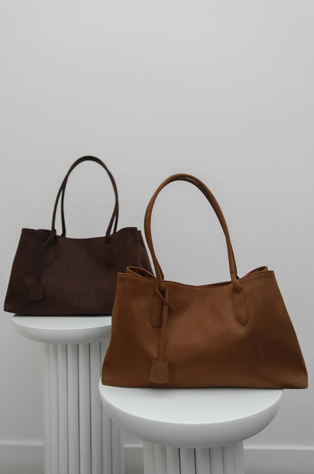 Çift saplı yapısı, omuzda rahat taşıma imkânı sunar. Yumuşak süet kumaşı, zarif bir görünüm ve dokusal zenginlik katar.