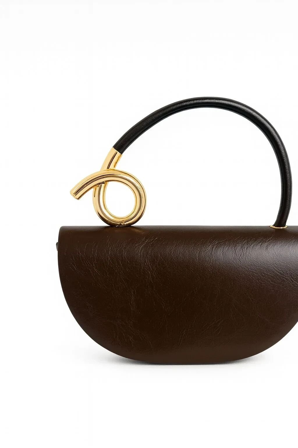 Modern yarım ay formu ve özgün metal sap detayıyla her kombine sofistike bir dokunuş katar.