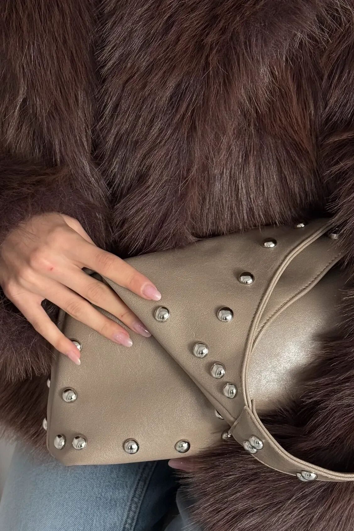 Yumuşak dokulu deri yüzeyi ve parlak metal perçinleriyle güçlü bir stil ifadesi oluşturur.