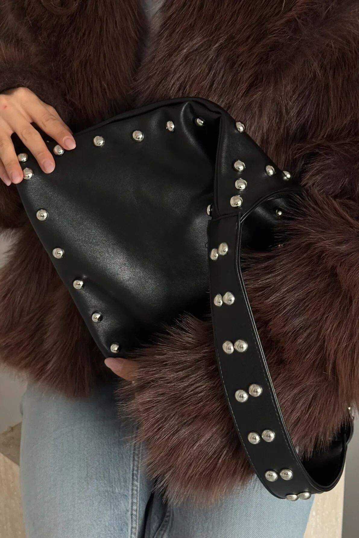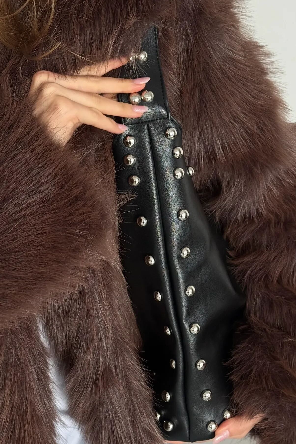 Yumuşak dokulu deri yüzeyi ve parlak metal perçinleriyle güçlü bir stil ifadesi oluşturur.