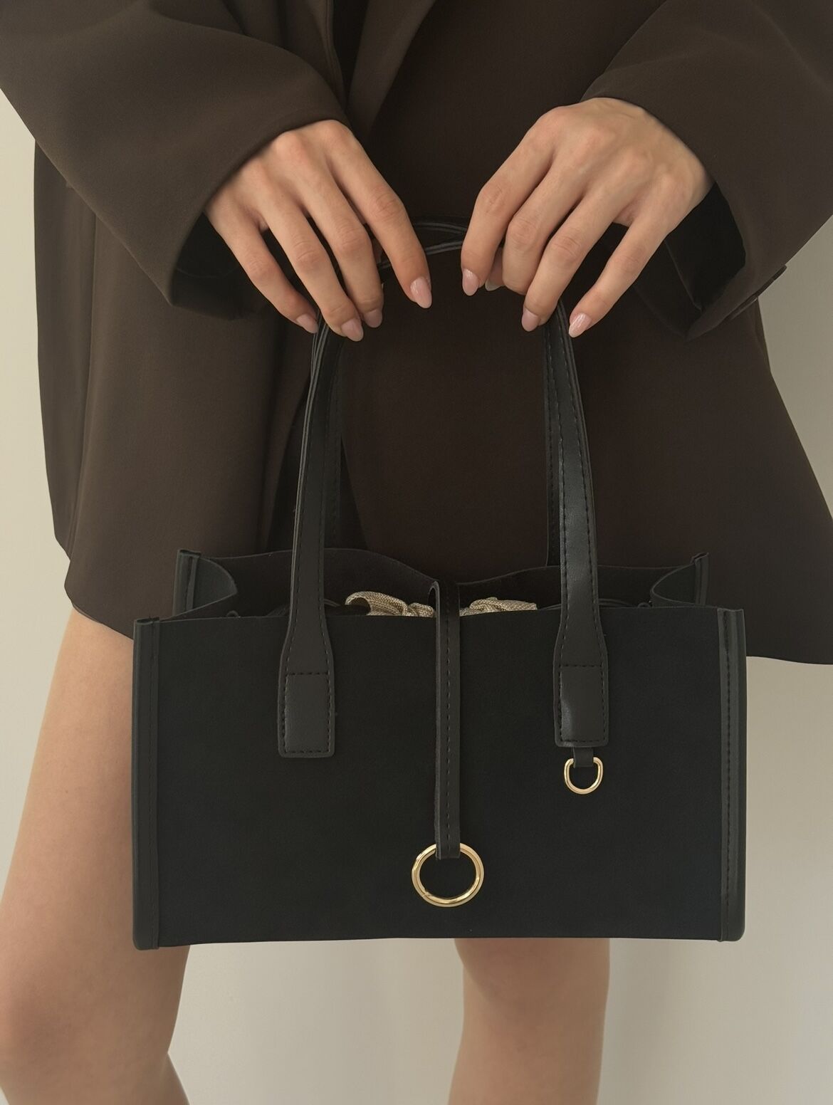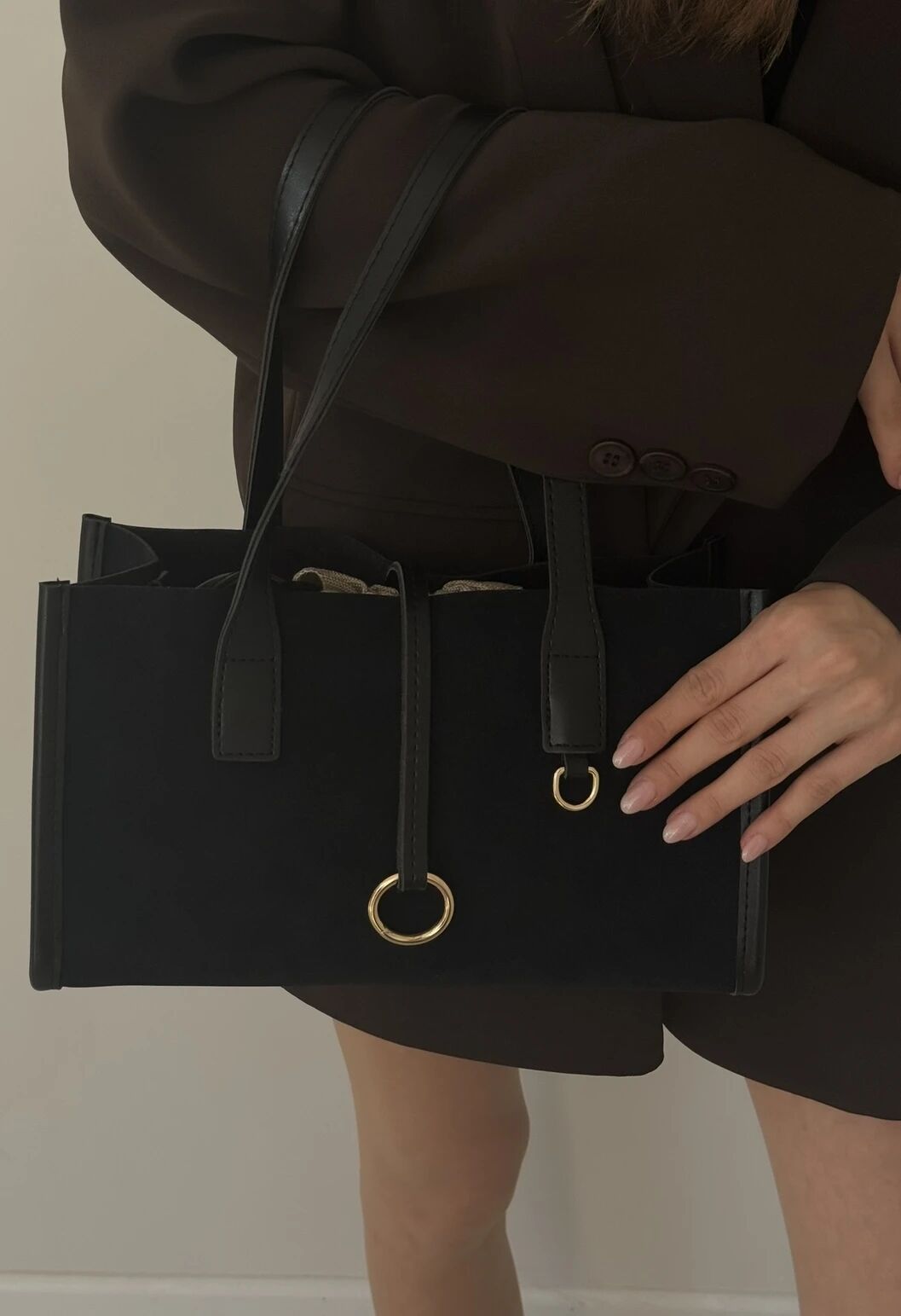 Astarsız iç yüzeyi sade ve doğal bir görünüm kazandırırken, hafif yapısıyla gün boyu konfor sağlar. Büzgülü bez iç torbası ve deri şerit ile uzanan altın halka detayı modern ve özgün bir dokunuş yaratır.