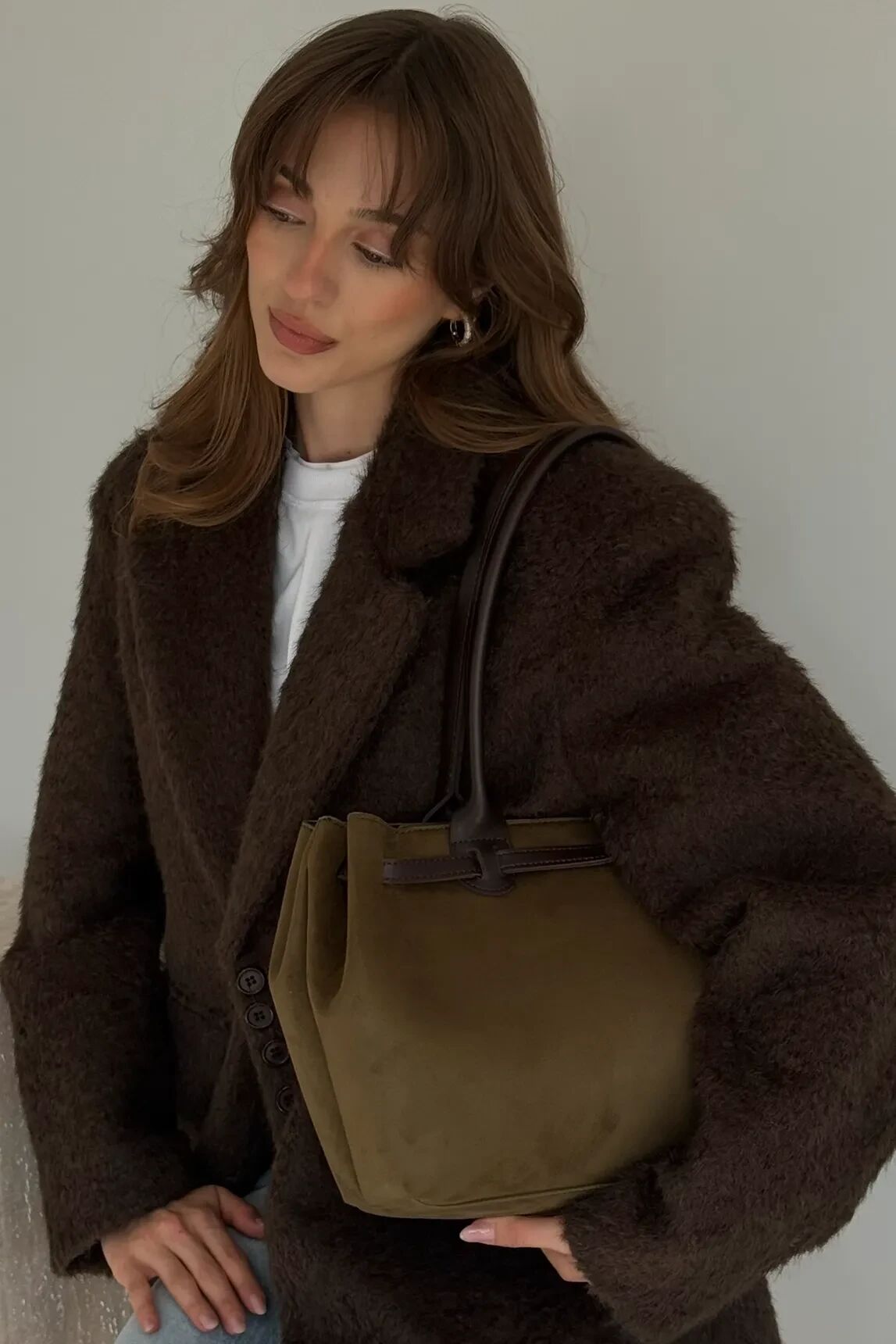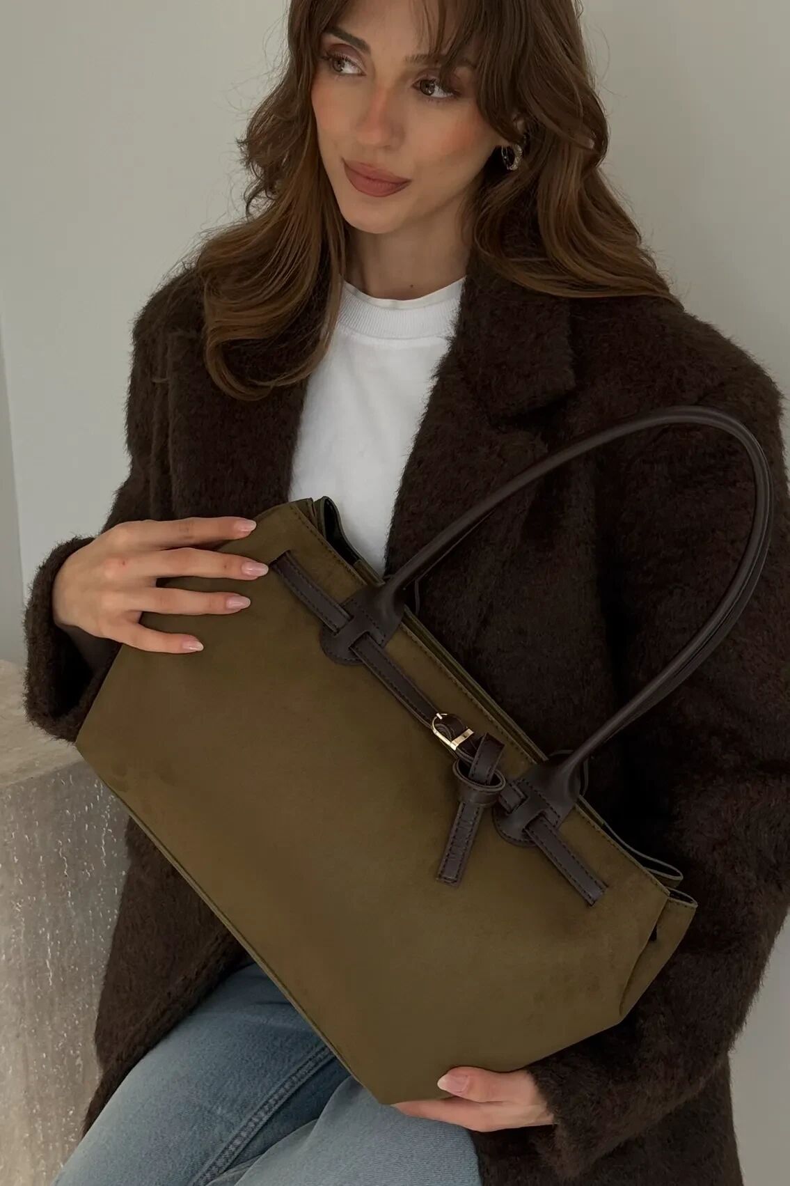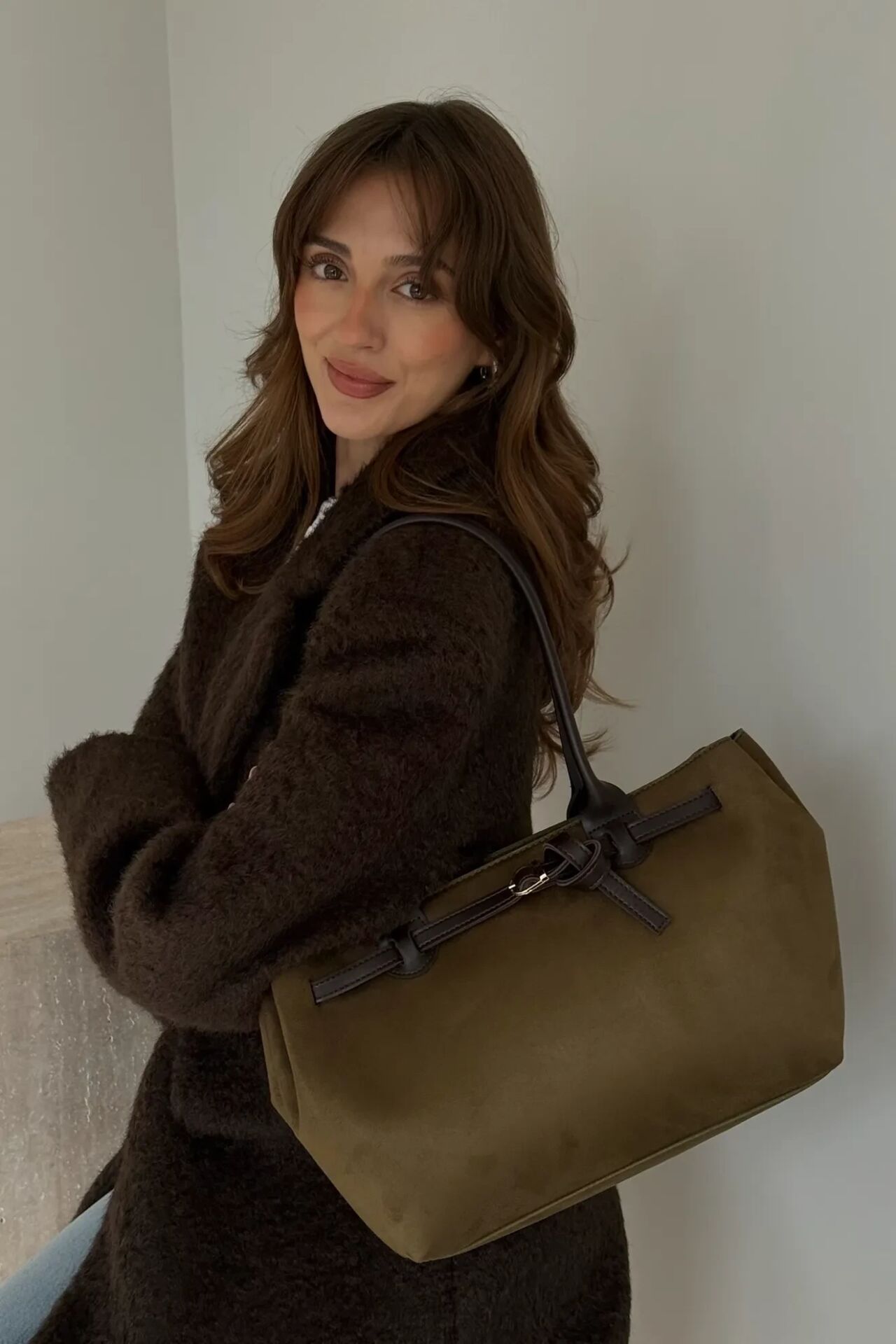 Koyu kahverengi sap ve kayış dokusu, çantanın haki rengini sofistike bir şekilde tamamlıyor.