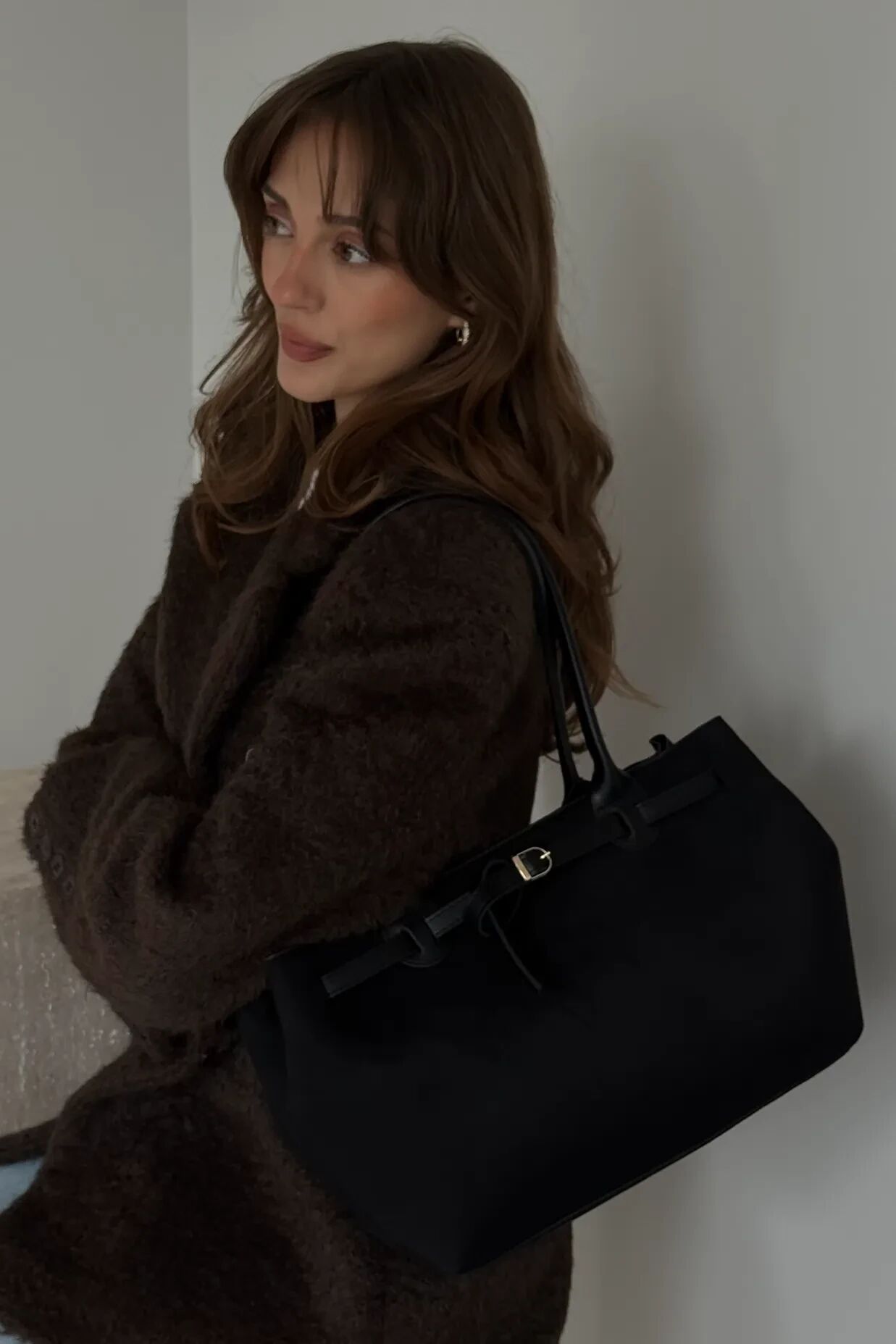 Gold toka detayı, sade tasarıma zarif bir ışıltı katarak çantayı şık bir aksesuara dönüştürüyor.