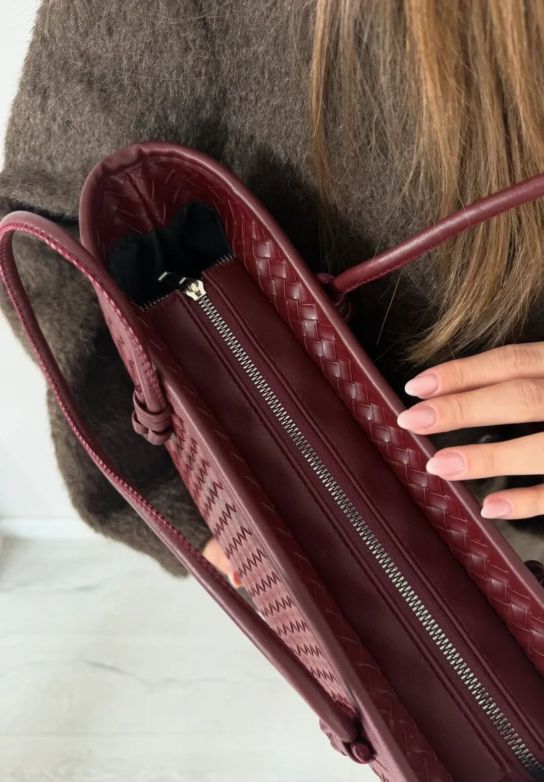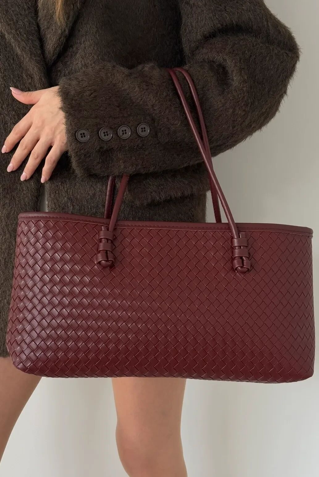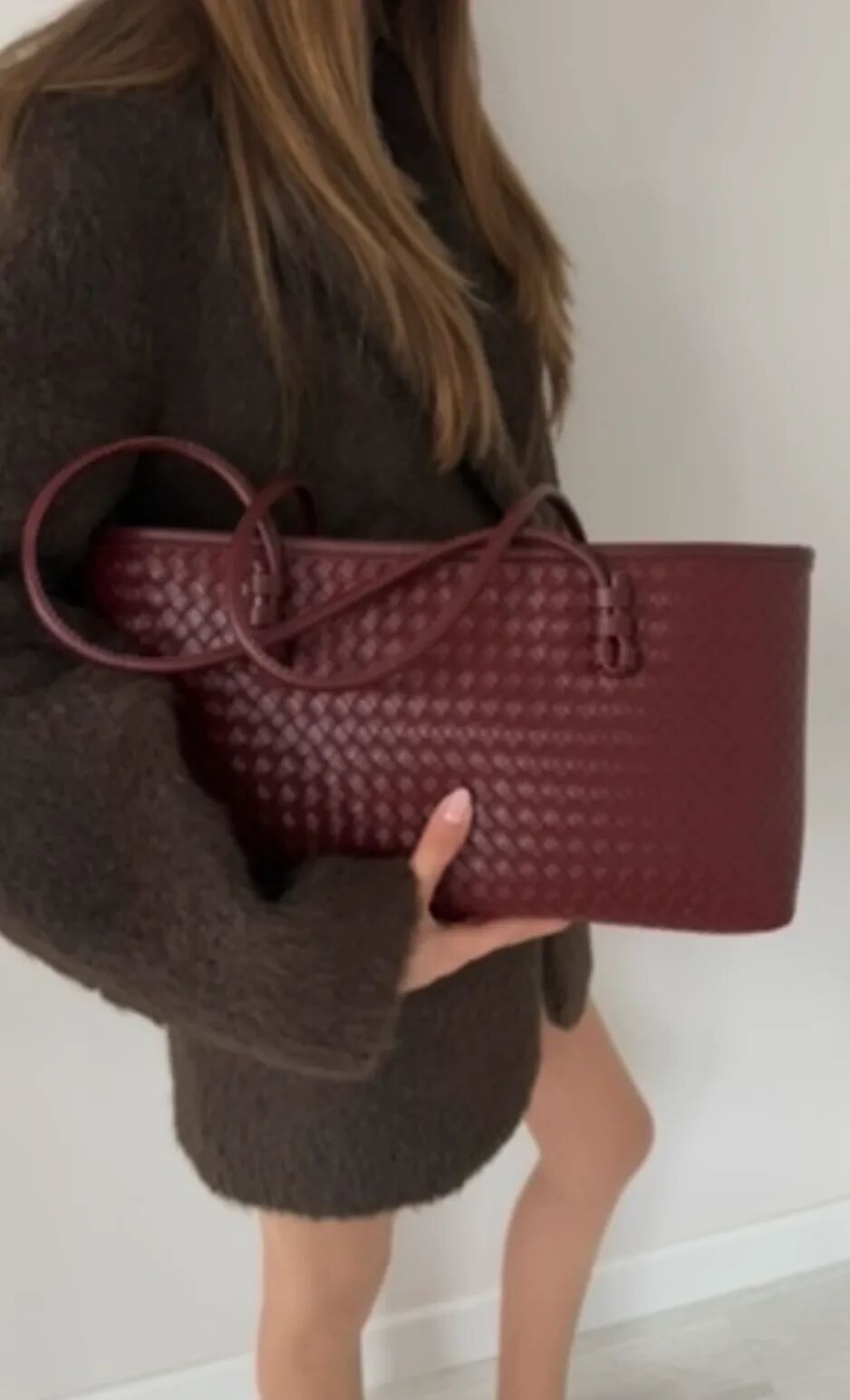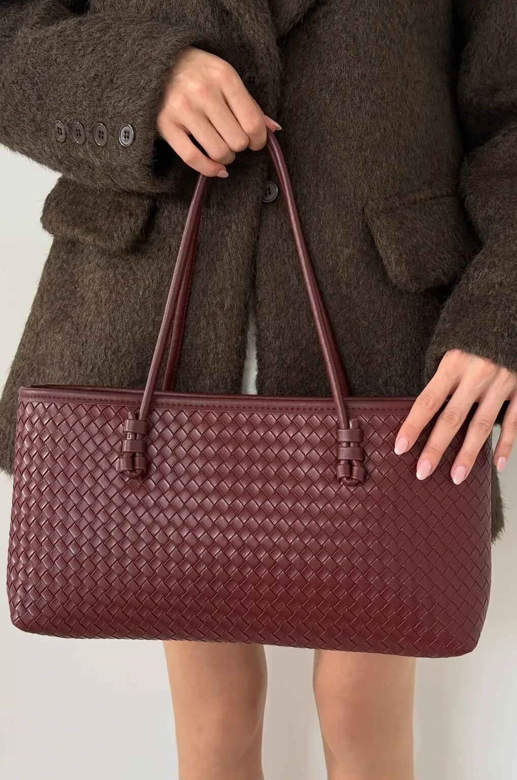 Yumuşak dokulu suni deri malzemeden üretilen bu örgü dokulu tote çanta, zarif ve modern tasarımıyla günlük kullanıma mükemmel şekilde uyum sağlar.
